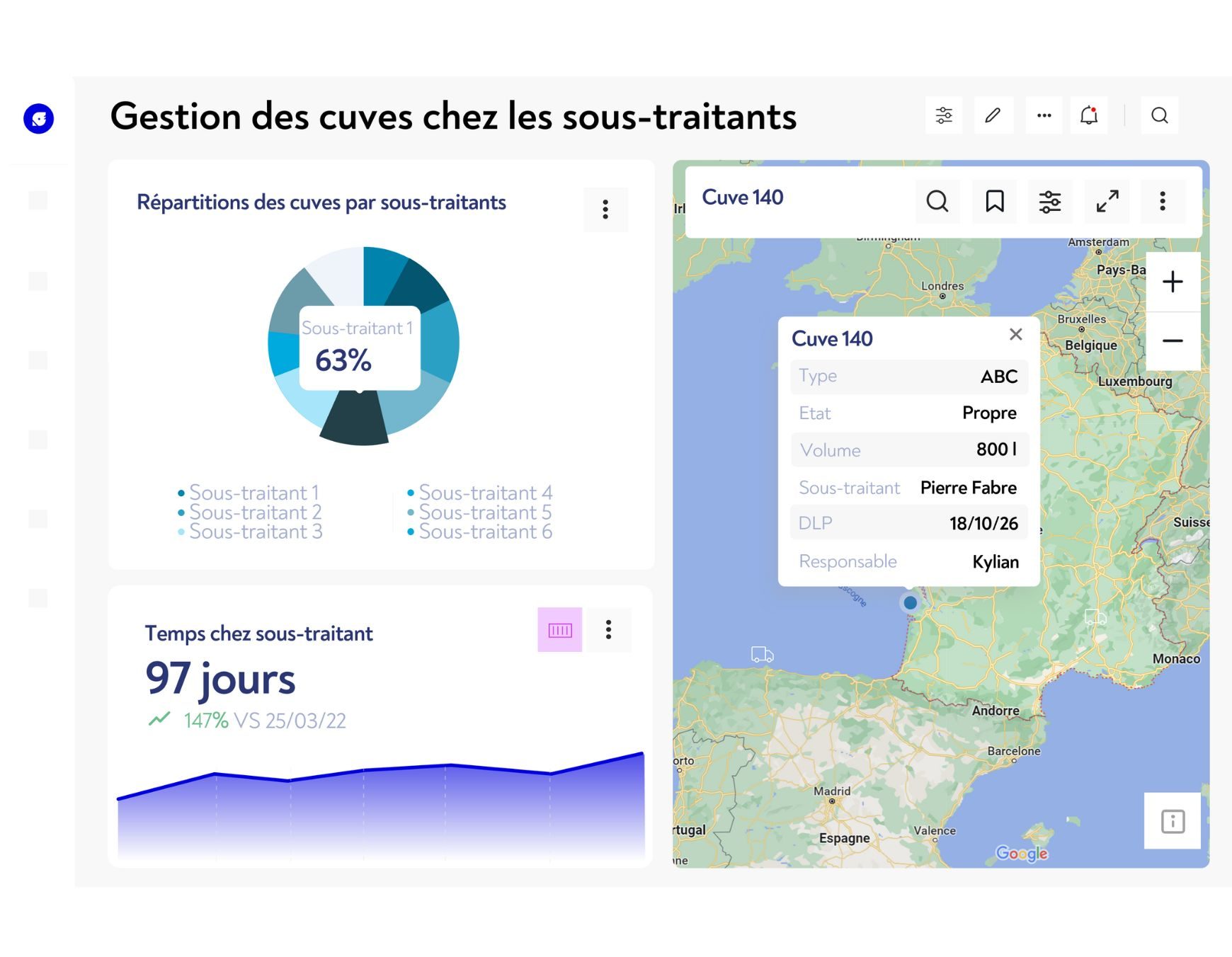 You can also visualize your hygiene status key performance indicators and  fill rates when your containers reach their destination and make them visible on a map, including outside from your production site.