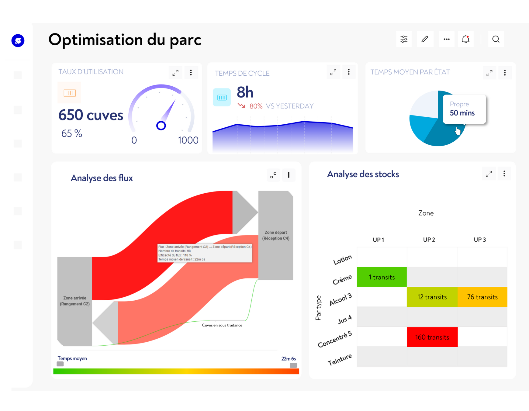 Optimize the size of your mobile tanks fleet. Know exactly how many tanks are in use and how many are at a standstill, so you don’t have to buy new equipment. Use an optimization tool to analyze your global production and identify non-productive cycles (mobile tank configuration, transport times) so you can interrupt them. Avoid overstocking and waste. Produce as close as possible to your needs.