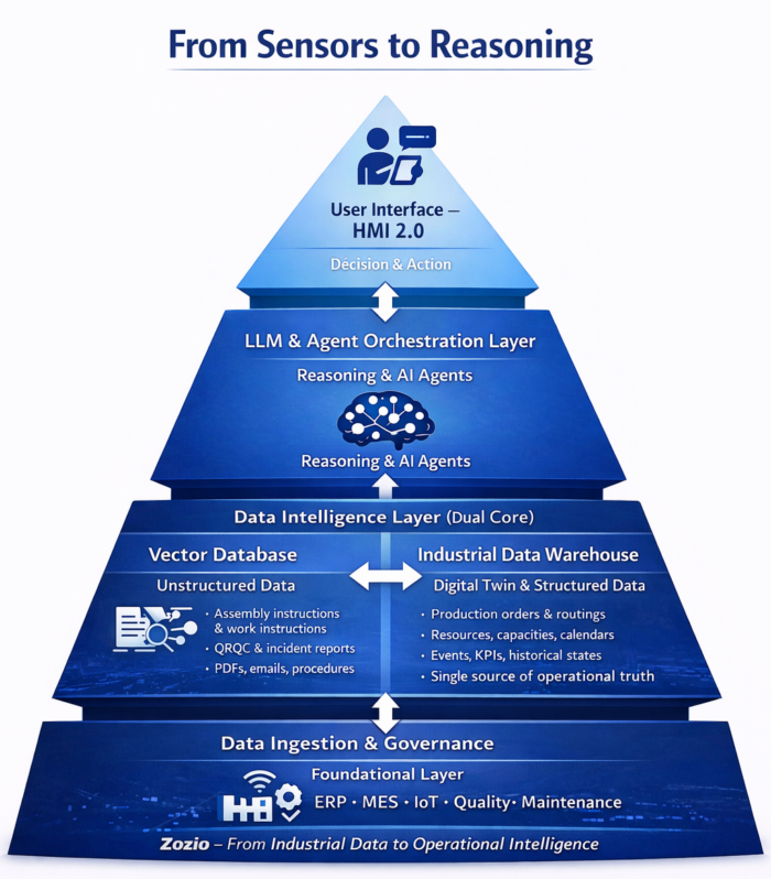 Le vrai problème n’est pas technologique, il est sémantique. Les machines parlent en protocoles (OPC-UA, MQTT), les systèmes parlent en tables SQL, et les humains parlent en langage naturel. Le pont entre ces mondes était, jusqu’ici, brisé.