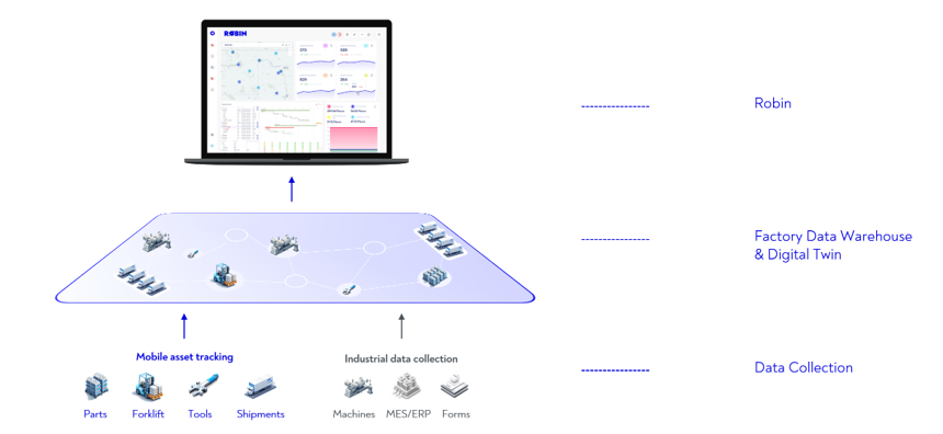 ROBIN est une app de gestion de traçabilité de la logistique industrielle, collaborative et connectée à destination des opérateurs, chefs de production et responsables méthode & Industrie 4.0 qui permet de visualiser en temps réel les encours de production pour éviter la surproduction, le gaspillage et pouvoir planifier en juste-à-temps.