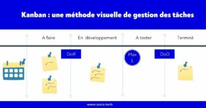 Pour mettre en place la méthode Kanban, on part du processus existant, que l’on modélise grâce à des tableaux. Ces tableaux sont séparés en différentes colonnes qui représentent les étapes, et les tâches sont représentées par des étiquettes.